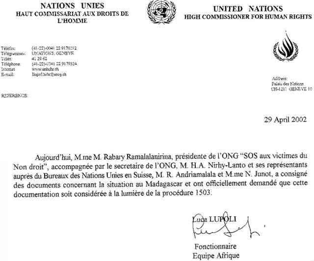 Mathilde Rabary dépose un dossier à l'ONUDes députés malgaches ont déposé ce mardi 30 avril 2002 à l'ONU, un dossier de plusieurs centaines de pages sur les victimes du non-droit à Madagascar. Relevant d'une procédure d'urgence compte-tenu des exactions et actes de barbarisme qui se multiplient sur le terrain, ce dossier a pour objectif d'alerter les institutions internationales sur les violations des droits de l'homme à Madagascar. Les déposants lancent un appel à témoignages aux personnes victimes ou témoins d'exactions à Madagascar, qui sont invitées à écrire à l'adresse email suivante : actionsmg@yahoo.fr Le dossier est à la disposition des journalistes et des chancelleries qui peuvent en faire la demande par email à cette même adresse.