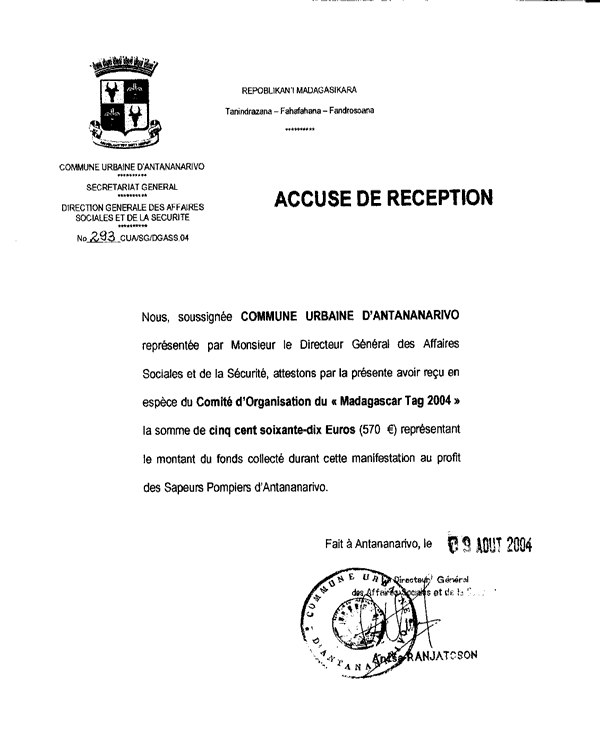 anliegend die Quittung von Antananarivo, die Übergabe des Erlöses
