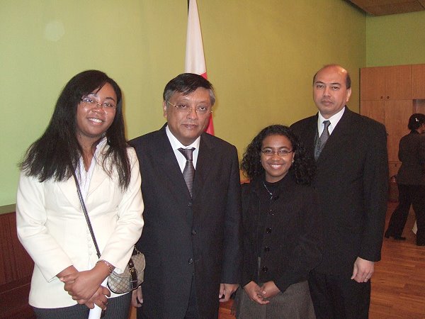 STEP students meet H.E. A. Ralison and H.E. Dr. Jean-Louis Robinson in Berlin - Fela Razafiarison and Zafindramonjy Hanjarisoa Tsitohaina, the first students from Madagascar to take part in the Students Experience Programme (STEP), were honoured to be invited to the the New Year´s celebration of the Embassy of Madagascar in Berlin on 27th January 2008. There they met H.E. Alphonse Ralison, Ambassador of Madagascar, and H..E. Jean-Louis Robinson, Minister of Health in Madagascar. Both students are carrying out four-month internships at Daimler AG in Stuttgart. Fela is working in the finance and controlling area whilst Hanja is working in sales & marketing. |